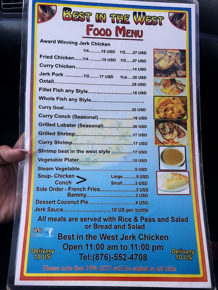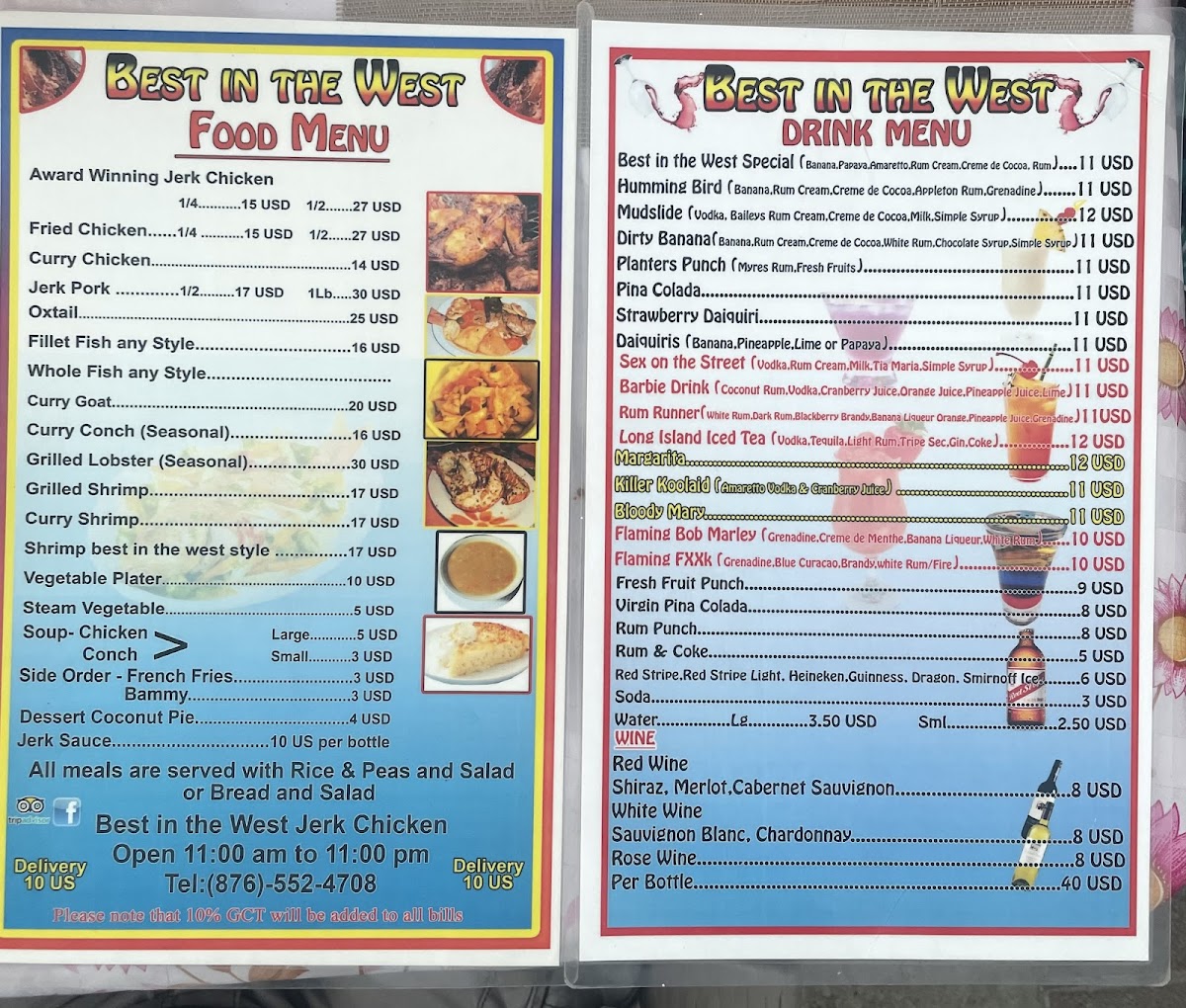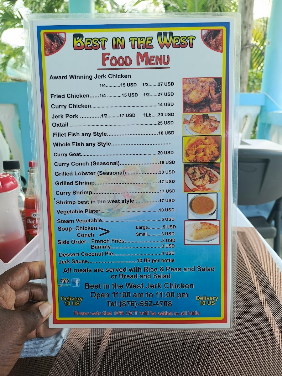 Welcome to Best In The West, a hidden gem located just a stone's throw from Negril's beautiful beaches in Paynes Town, Jamaica. Known for its authentic Jamaican cuisine, this charming eatery offers a delightful menu that features everything from Jerk Chicken and Fried Escoveich to comforting Seafood and Pumpkin Chicken Soups. The local charm is palpable, with open-air seating inviting you to savor meals cooked over charcoal grills right at the entrance.