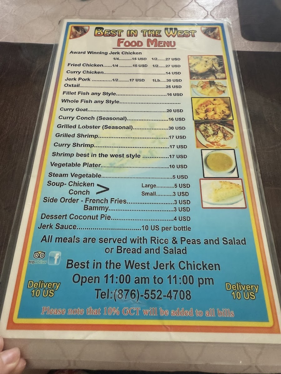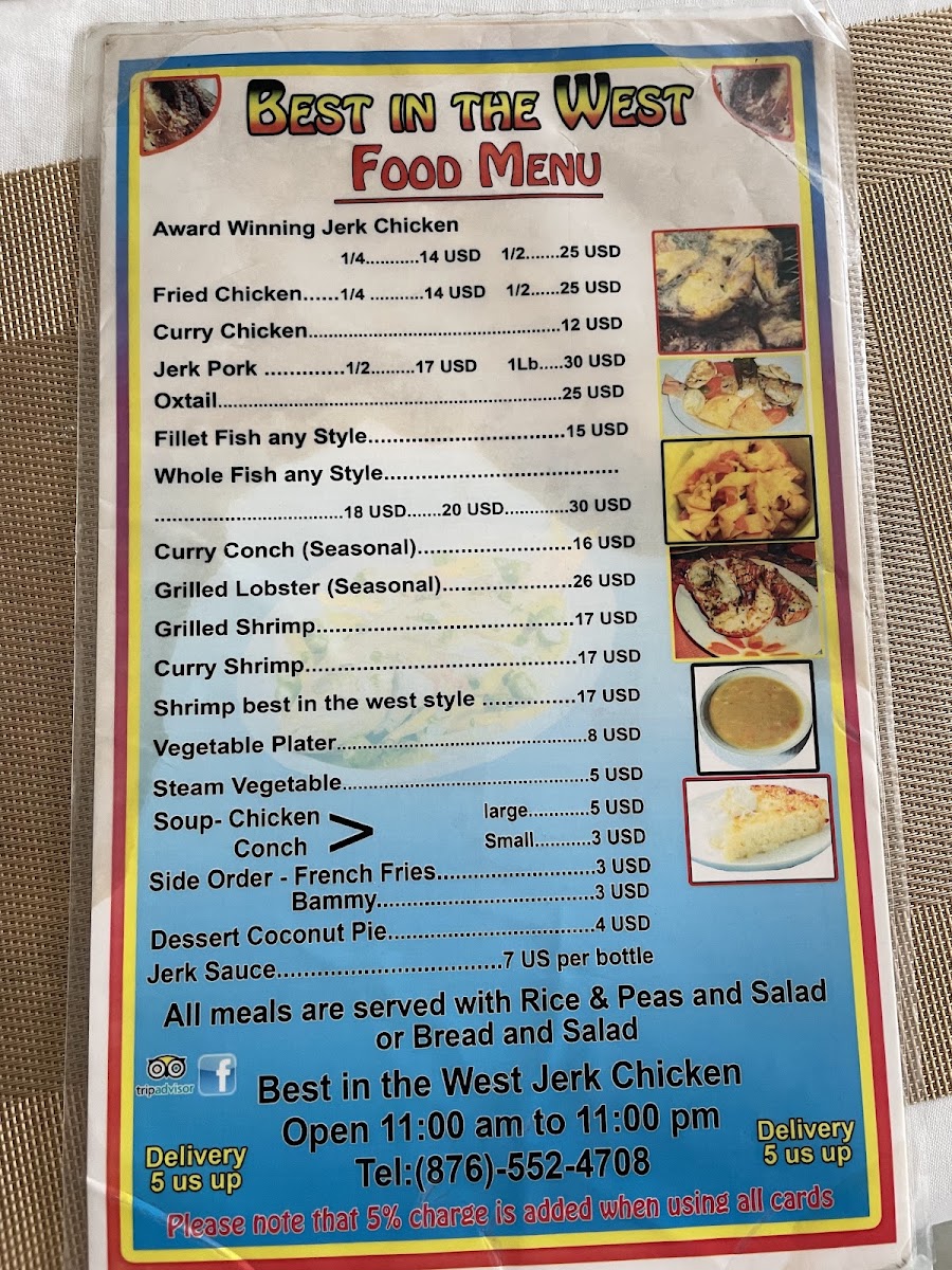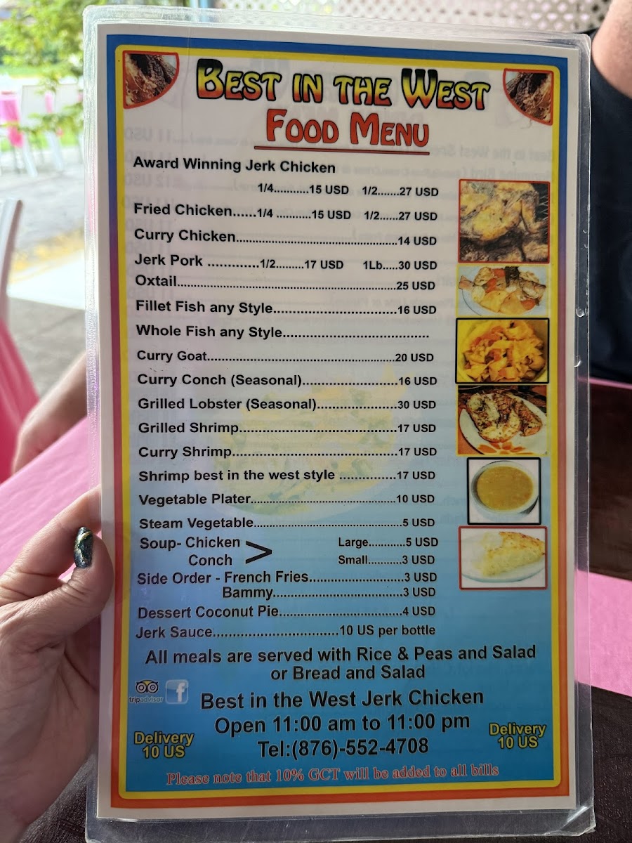 Welcome to Best In The West, a hidden gem located just a stone's throw from Negril's beautiful beaches in Paynes Town, Jamaica. Known for its authentic Jamaican cuisine, this charming eatery offers a delightful menu that features everything from Jerk Chicken and Fried Escoveich to comforting Seafood and Pumpkin Chicken Soups. The local charm is palpable, with open-air seating inviting you to savor meals cooked over charcoal grills right at the entrance.